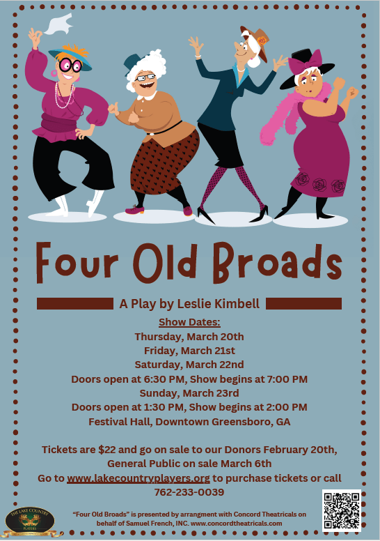 Thank you everyone for your continued support of LCP. Without you, and donors like you, we would not be able to produce the quality, entertaining performances you have come to expect. To start our 2025 productions, we present Four Old Broads by Leslie Kimbell.